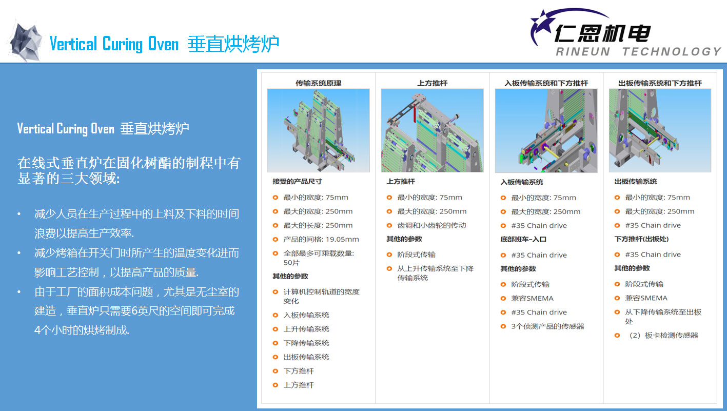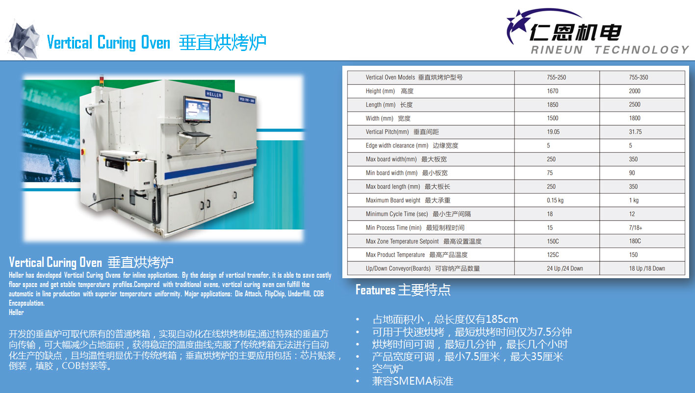 HELLER VCO 755-350微型垂直炉按每片150mm的载具厚度,4mm传动链条pin长度规格来计算,生产节拍可达25~60秒。宽PCB板可达250mm。更可选择双轨道上料满足高产能需求。