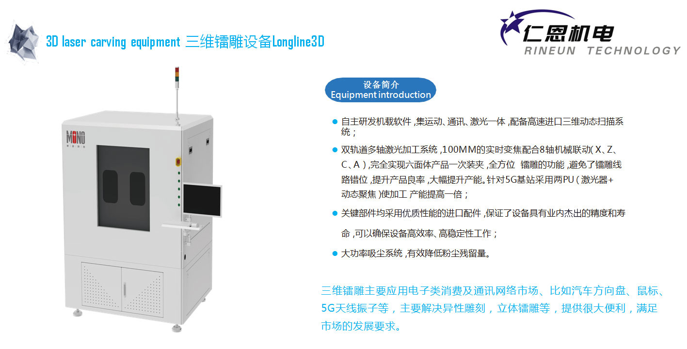 三维镭雕主要应用电子类消费及通讯网络市场、比如汽车方向盘、鼠标、5G天线振子等,主要解决异性雕刻,立体镭雕等,提供很大便利,满足市场的发展要求。